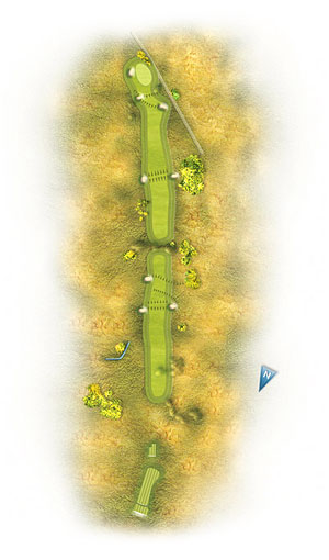 A ridge running across the fairway divides this par 5. Fairway bunkers have to be safely negotiated if the green is to be reached in two.