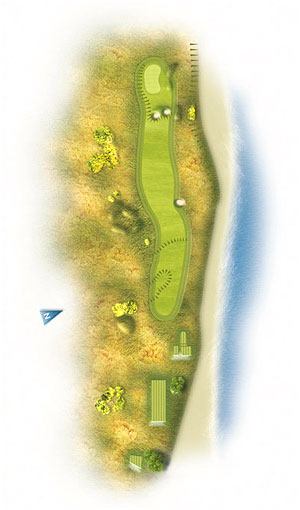 Generally plays into the prevailing wind with out of bounds to the right and heavy rough left. Club selection is everything for the approach shot to an elevated green, well protected by bunkers.